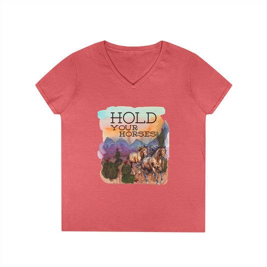 Ladies' V-Neck T-Shirt - "Hold Your Horses" Watercolor Design - Perfect for Equestrian Lovers
