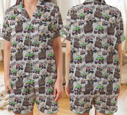 Holiday Monster Trucks Kid and Youth Satin Short-Sleeve Pajamas Set